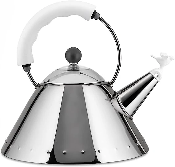 This celebrated kettle with the bird that sings when the water has boiled was a great success when it was introduced in 1985, and for Alessi it represented a meeting of great design and mass production methods, a combination that Michael Graves worked hard to achieve, applying his personal visual code which fused influences from Art Deco to Pop Art.