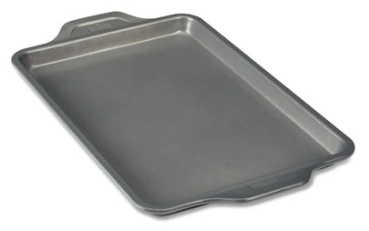 Sheet pans are essential pieces for any passionate baker, from budding to professional, and this Jelly Roll Pan is no exception. With 1″ high rims and standard jelly roll dimensions, this pan lives up to its namesake for recipes that explicitly call for this size, such as a Swiss roll cake or holiday bûche de Noël. Oversized handles allow for a safe grip of the pan, even while wearing mitts. The durable ceramic-reinforced PFOA-free nonstick finish is specially designed for baking, releasing moist cakes, gooey cookies, and sticky treats with ease, batch after batch.