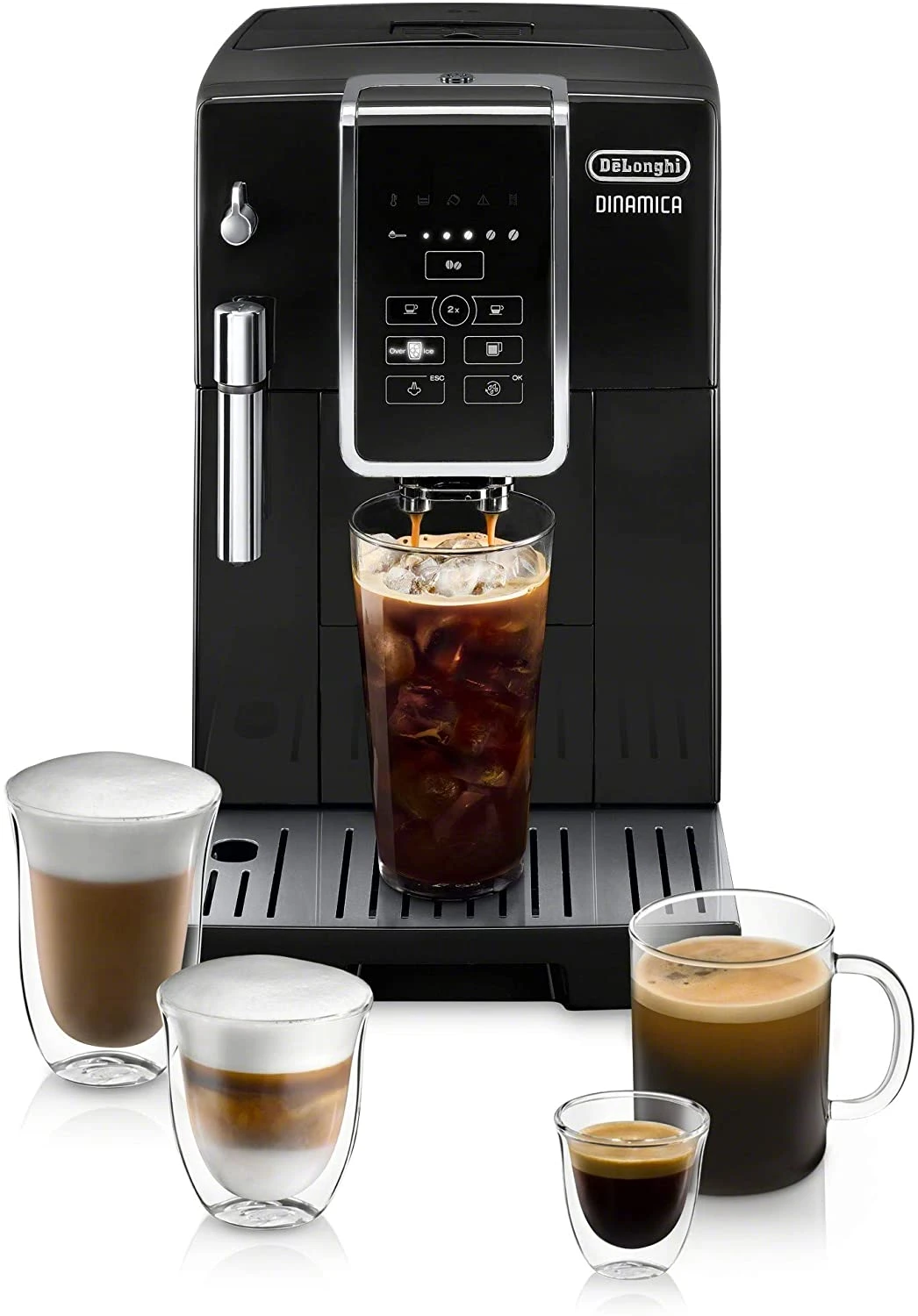 Dinamica, one touch drink selection, touch panel control panel with backlit icons, brew single or double espressos, 3 length levels, 5 strength levels, my coffee option, automatic cappuccino system, variable foam levels, stainless steel, new brew over ice recipe for delicious, iced coffee