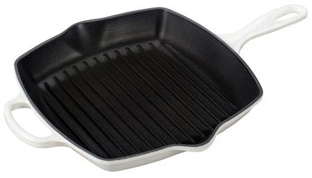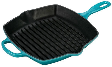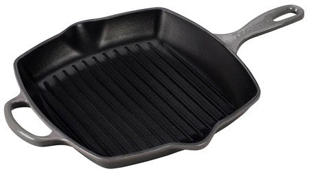 The Square Skillet Grill’s interior is coated with Le Creuset’s protective satin black finish to prevent damage and wear. Over time, this slightly abrasive interior develops a natural patina that is ideal for searing and frying.