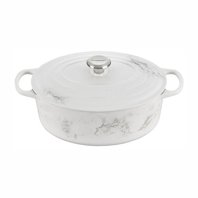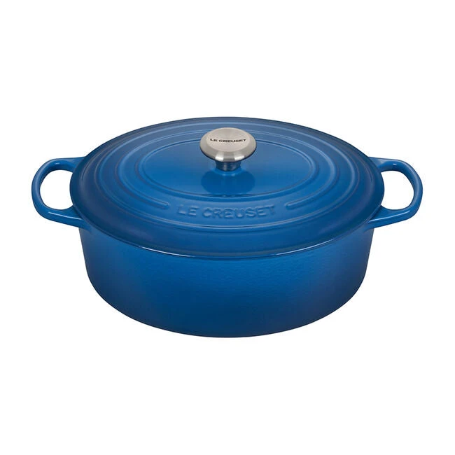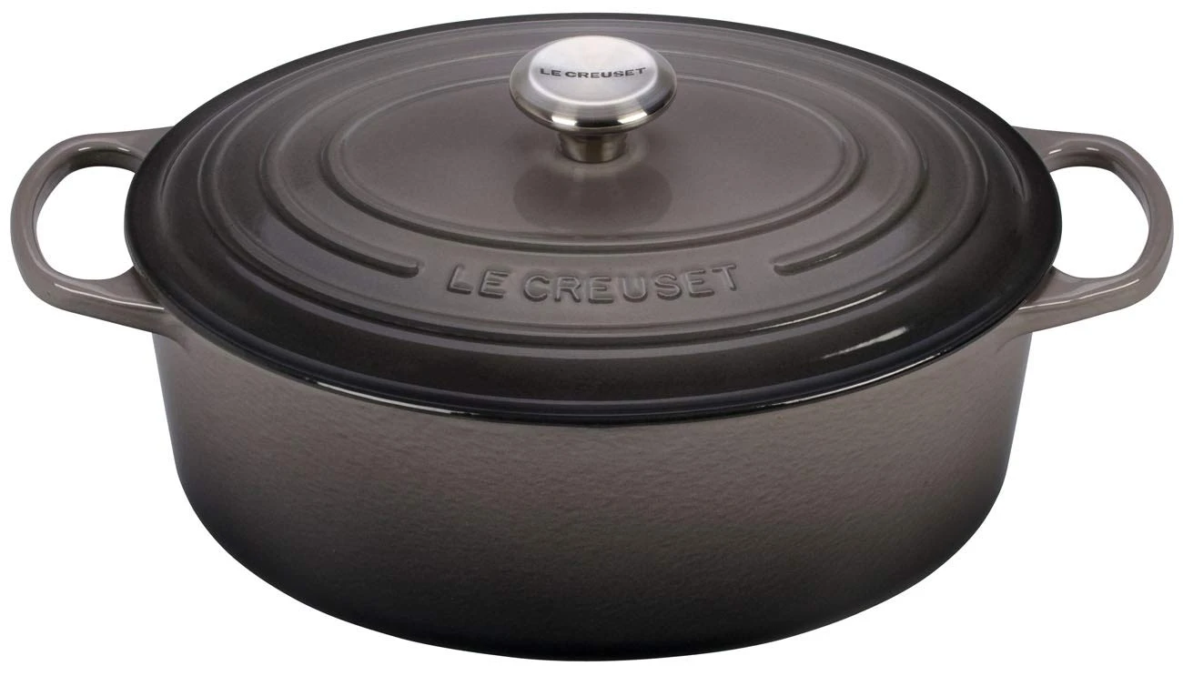 The iconic Le Creuset oval Dutch oven is indispensable in the kitchens of home cooks and professional chefs alike. Long recognized for its strength and durability, cast iron is the prime material for slow-cooking, braising and roasting, thanks to its ability to maintain even and consistent heat. The enameled oval Dutch oven needs no seasoning, and it’s suitable for both stovetop and oven use. The oval shape is particularly suited to longer cuts of meat or poultry.