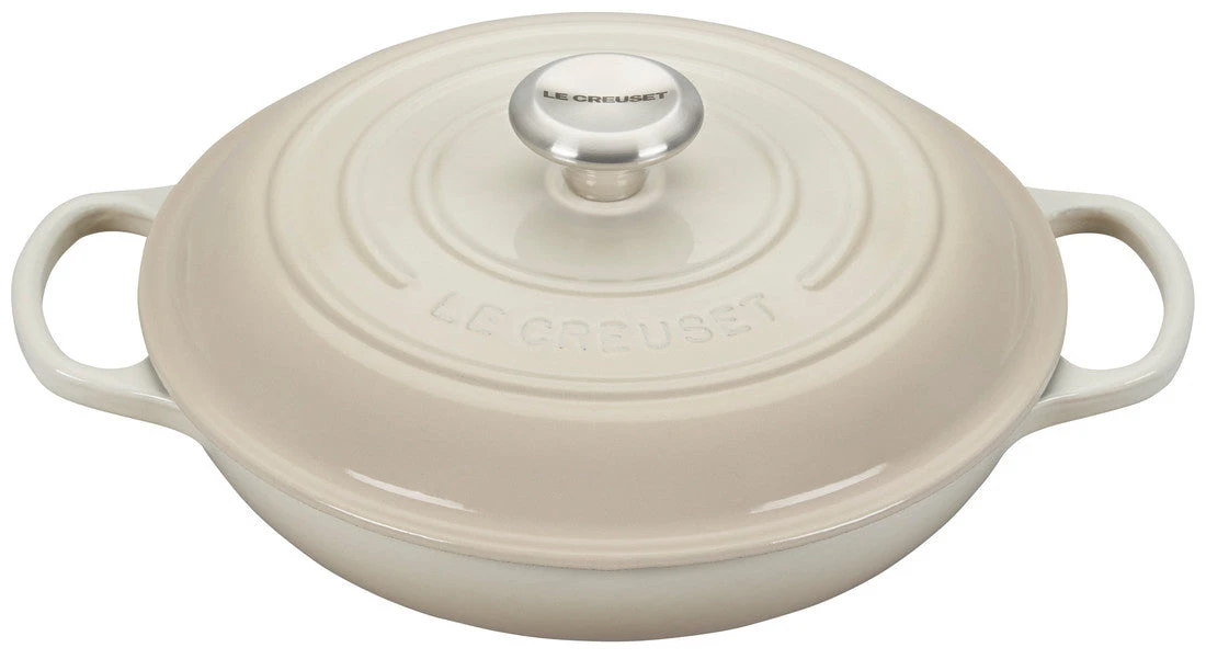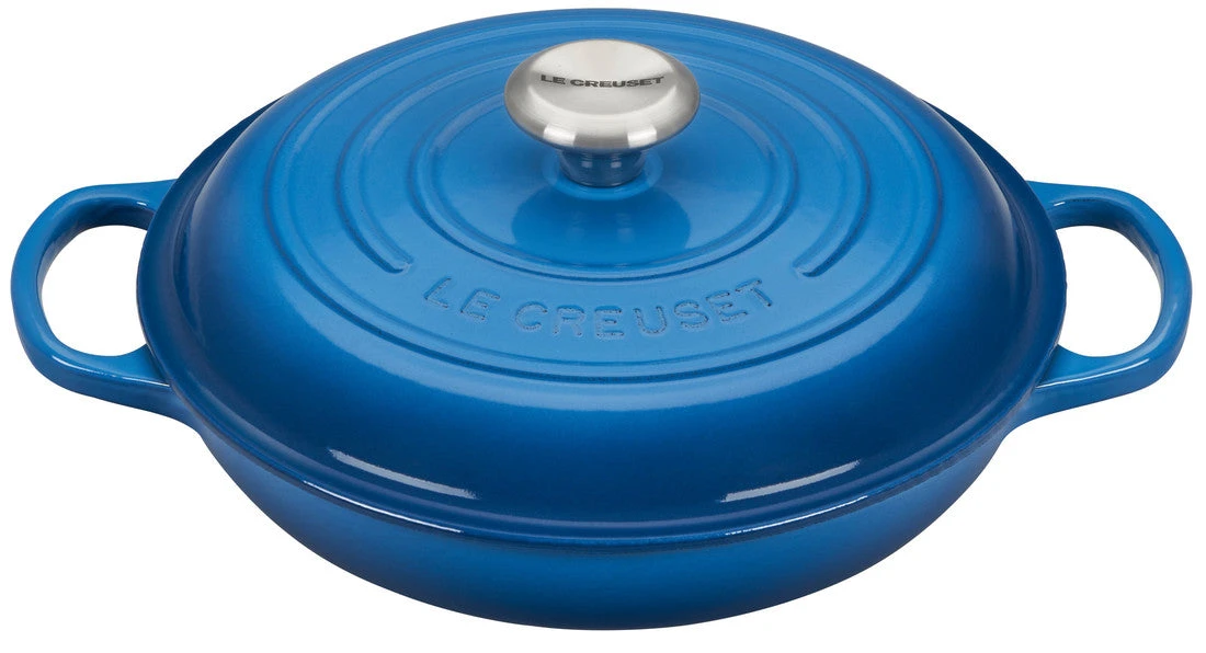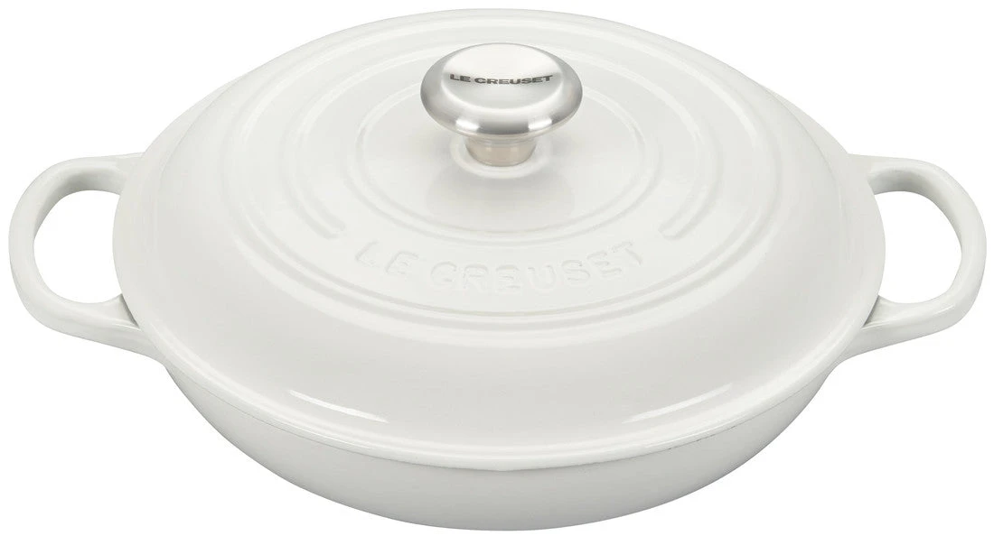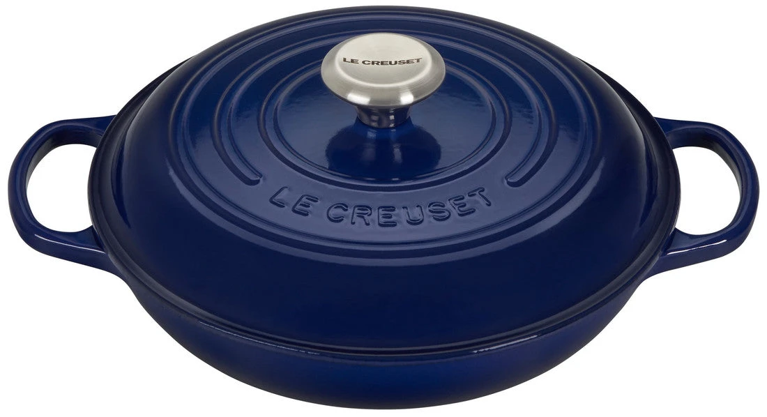 The enameled cast iron braiser is uniquely designed for maximum performance, transforming tough cuts of meat and hearty vegetables into tender, flavorful dishes. Food is first seared over high heat, then finished slowly in a flavorful liquid. The wide base of the braiser allows ingredients to be placed in a single layer for proper searing; once liquid is added, the domed lid continuously circulates steam to lock in moisture and flavor.