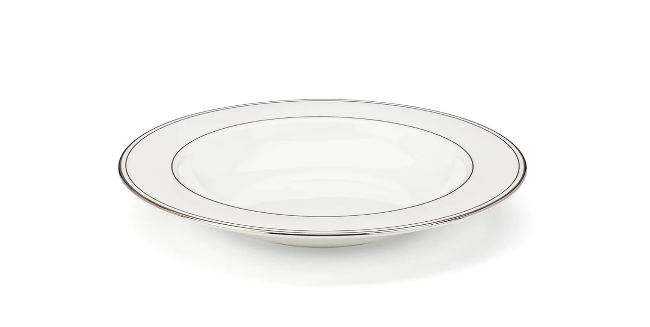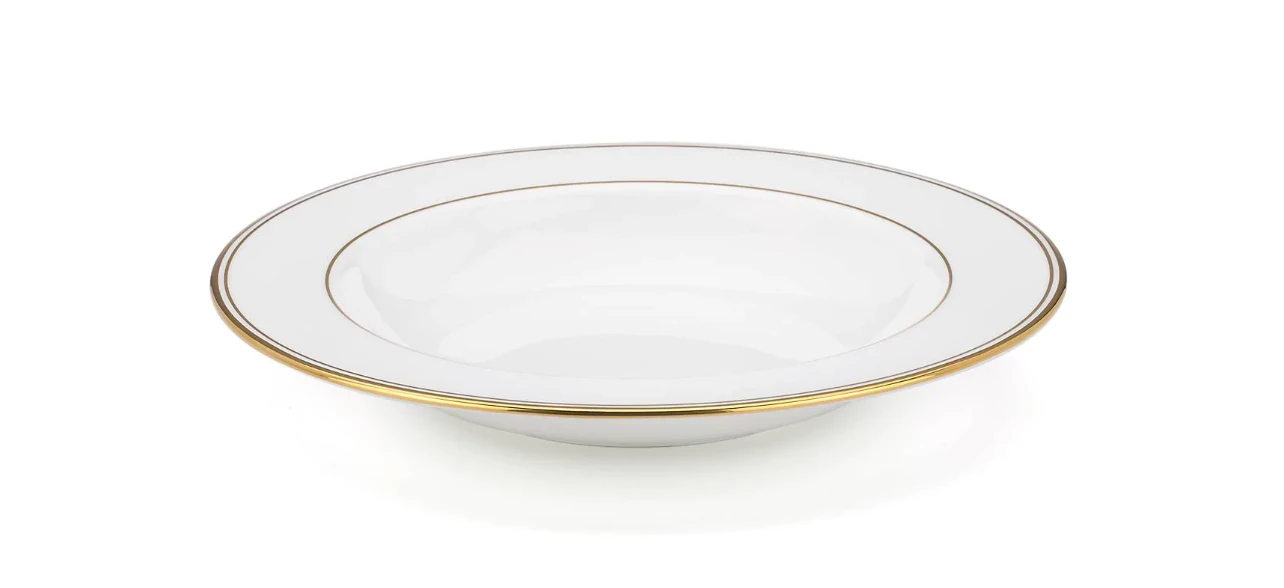 Crafted of durable white porcelain and featuring the elegant shimmer of 24-karat gold along its edge, this rimmed soup bowl is heirloom quality and elevates a meal from casual to formal. This item is dishwasher-safe, for added convenience.