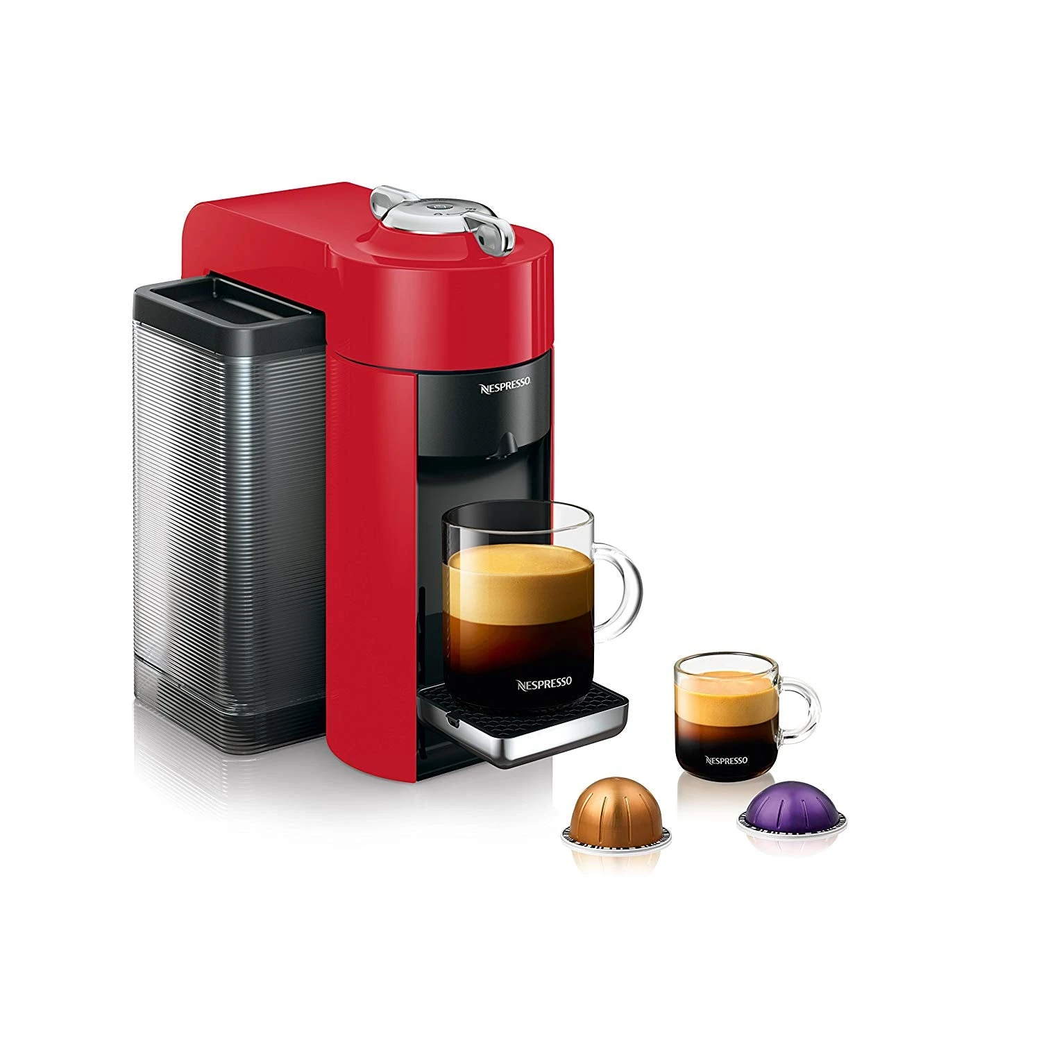 Nespresso is constantly evolving the way you drink espresso and coffee. Now the pioneers of single-serve coffee, Nespresso, introduces the VertuoLine Evoluo by De’Longhi with an all-new design and colors. Offering freshly brewed Coffee with crema as well as delicious, authentic Espresso, the Evoluo machine conveniently makes two cup sizes, 7.7 fl. oz. Coffee and 1.35 fl. oz. Espresso, at the touch of a button. It uses two different capsule sizes: large capsule for Coffee and a small one for Espresso.