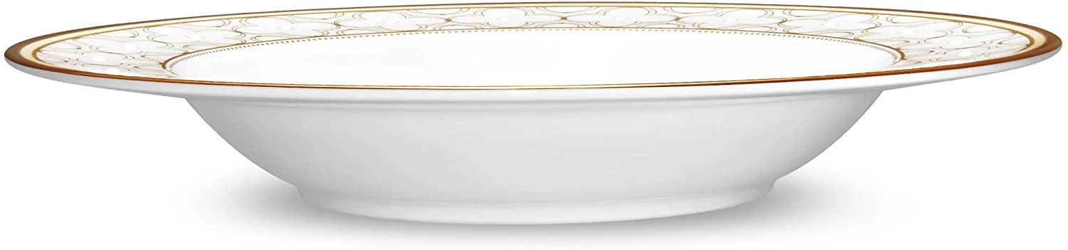 Trefolio Gold features a repeating stylized four-leaf-clover design, presented in multiple sizes on different pieces for maximum impact. The larger presentation is punctuated with raised enamel dots. The soft coloration of white and cream paired with gold makes this pattern accessible and appropriate to pair with any style of decor.