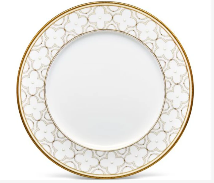 Trefolio Gold features a repeating stylized four-leaf-clover design, presented in multiple sizes on different pieces for maximum impact. The larger presentation is punctuated with raised enamel dots. The soft coloration of white and cream paired with gold makes this pattern accessible and appropriate to pair with any style of decor.