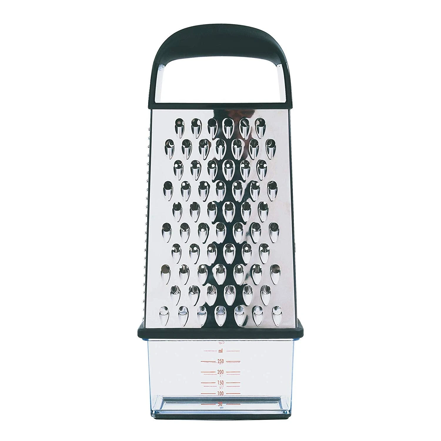 Our Box Grater features 4 stainless steel surfaces: 2 wide ones for coarse and medium grating and 2 slimmer ones for fine grating and slicing. A convenient container with non-slip base, measurement markings and lid attaches to the bottom for catching and storing freshly grated ingredients.