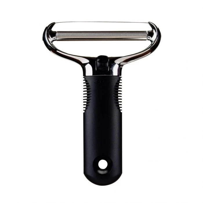 Slicing cheese just got easier with the OXO Good Grips Wire Cheese Slicer with Replaceable Wires. The stainless steel wire is easy to load and is tightened into place with the convenient tensioning wheel. The tensioning wheel can also be used to tighten wires that loosen over time. The sturdy, die cast zinc construction and the soft, comfortable handle allow you to easily pull the wire through medium and hard cheeses. Adjust the angle of your wrist to change from thick to thin cheese slices. The Wire Cheese Slicer is dishwasher safe and includes one stainless steel replacement wire in the package.