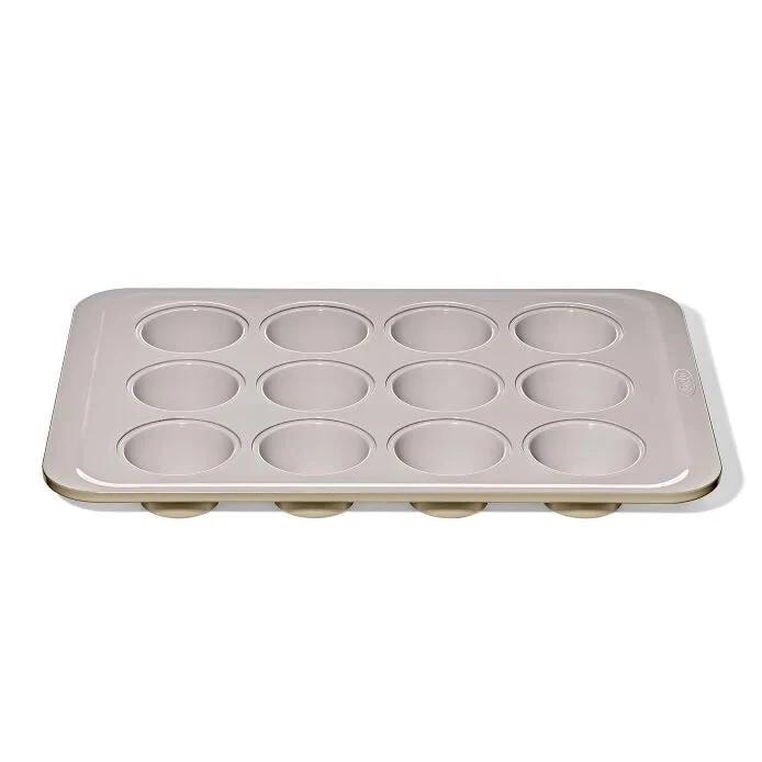 The OXO Good Grips Non-Stick Pro Ceramic Coated Metal Bakeware 12-Cup Muffin Pan is a bakeware solution that’s beautiful, durable and easy to clean. The muffin pan is perfect for making a dozen sweet or savory muffins, each sized about 2.75 inches. The efficient ceramic non-stick coating heats quickly and evenly, allows for easy food release and protects against scratching, staining, corrosion and abrasion. Get consistent results – the light interior coating color has been optimized for even browning for both sweet and savory baking. The bakeware is constructed from heavy-gauge aluminized steel for stability, even heat distribution and durability for years to come. The square-rolled edge adds structure and strength to the bakeware, and the wide rims provide a secure grip for easier handling in and around the oven. Each pan features pan dimension markings on the top surface, so you can find the right bakeware item for your recipe. Zero-draft walls on our cake pans allow for straight and uniform cake layers. Rounded interior corners allow for easier cleaning. Hand wash for best results.