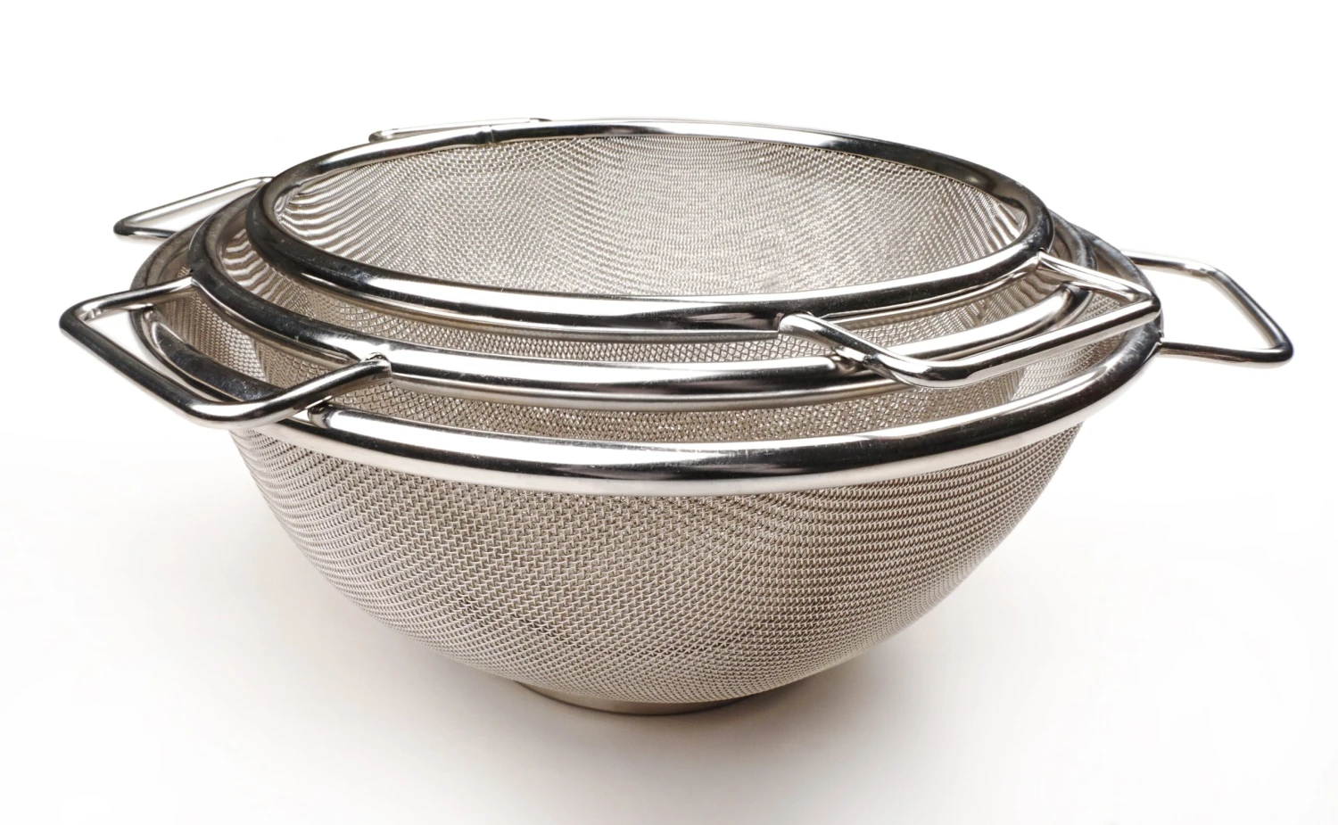 Three nesting colanders are made of 18/8 stainless steel wire mesh with 1/2? tall base for quick draining and easy-to-hold wire handles. Sizes: 8 inch x 4 inch, 9 inch x 4-1/2 inch, and 10 inch x 5 inch (approx. 2, 3 and 4 qt. capacities). Dishwasher safe.