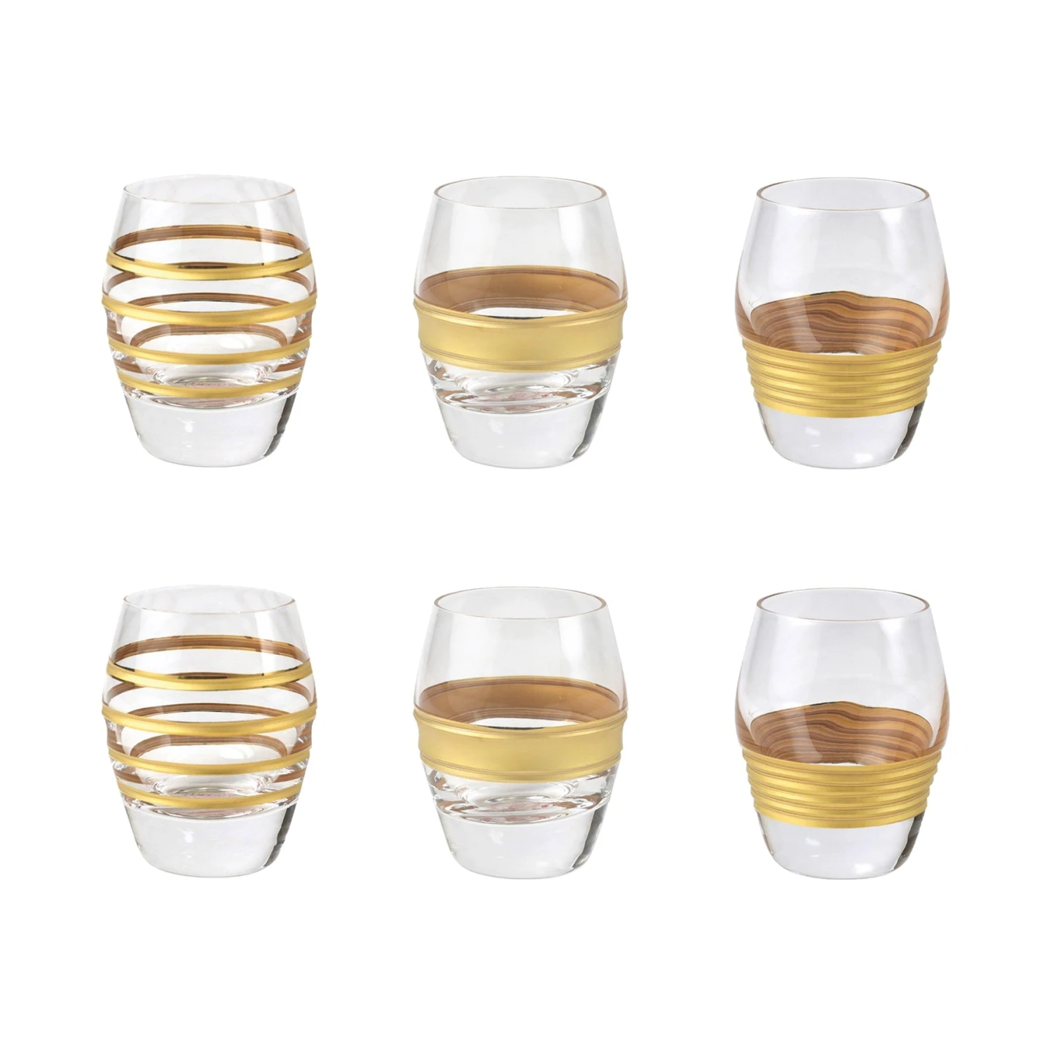 Gilded gold designs encircle the classic shape of the Raffaello Assorted Liquor Glasses.