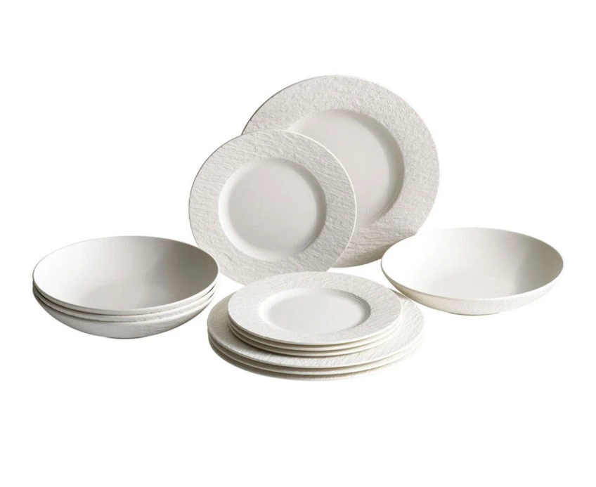 Entertain in style with the trend setting Manufacture Rock collection. This 12 pc set, available in either original Manufacture Rock (black) or Manufacture Rock Blanc (white) is service for four. The set includes four each of : 10.5″ x 10.5″ x .75″ h Dinner Plates, 8.5″ x 8.5″ x .75″h Salad Plates, and 9.25″ x 9.25″ x 2″ h (capacity approx 14.5 oz) Individual Pasta Bowls. Purchase a set of each to mix and match in dramatic fashion! Dishwasher and Microwave Safe. Made in Germany.