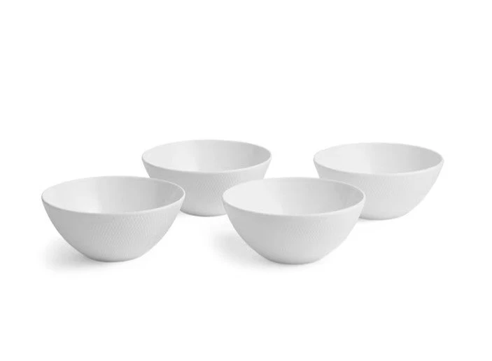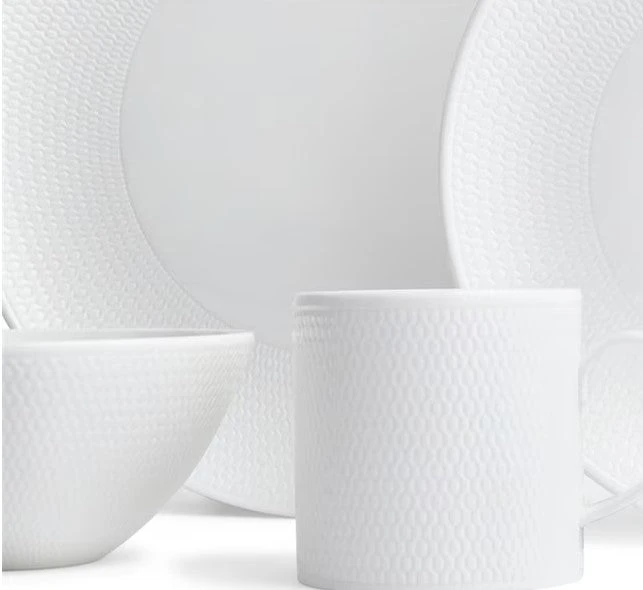 - Stylish White fine bone china with a distinctive intaglio texture